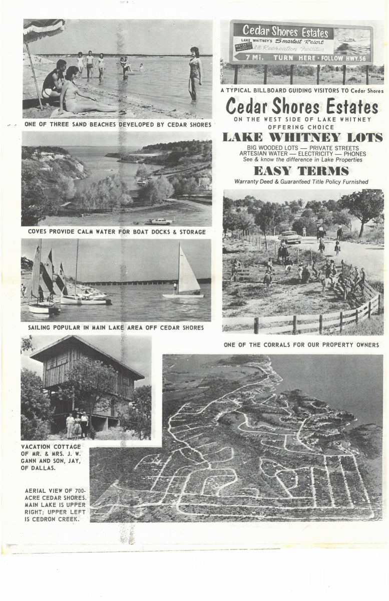 Cedar Shores Estates was developed in the late 1950’s, and many homes went up immediately and during the early 1960’s. This was a master planned community for lakeside vacationing at Lake Whitney, Texas. The owner and developer was Bill Holloman. At that time the water level was many feet lower, allowing for quite an infrastructure of roads and amenities in the original design of the community. The community had over 11 miles of roads that went all the way over and all around Girl Scout Island, included sandy beaches, picnic areas and playgrounds. Many people enjoyed what was a luxurious lake life with a second vacation home back in those days. It was a well planned and kept community. These pictures show what it was like!
